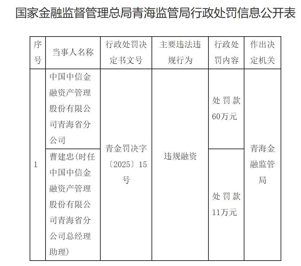 扬帆配资 中信金融资产青海分公司因违规融资被罚60万元