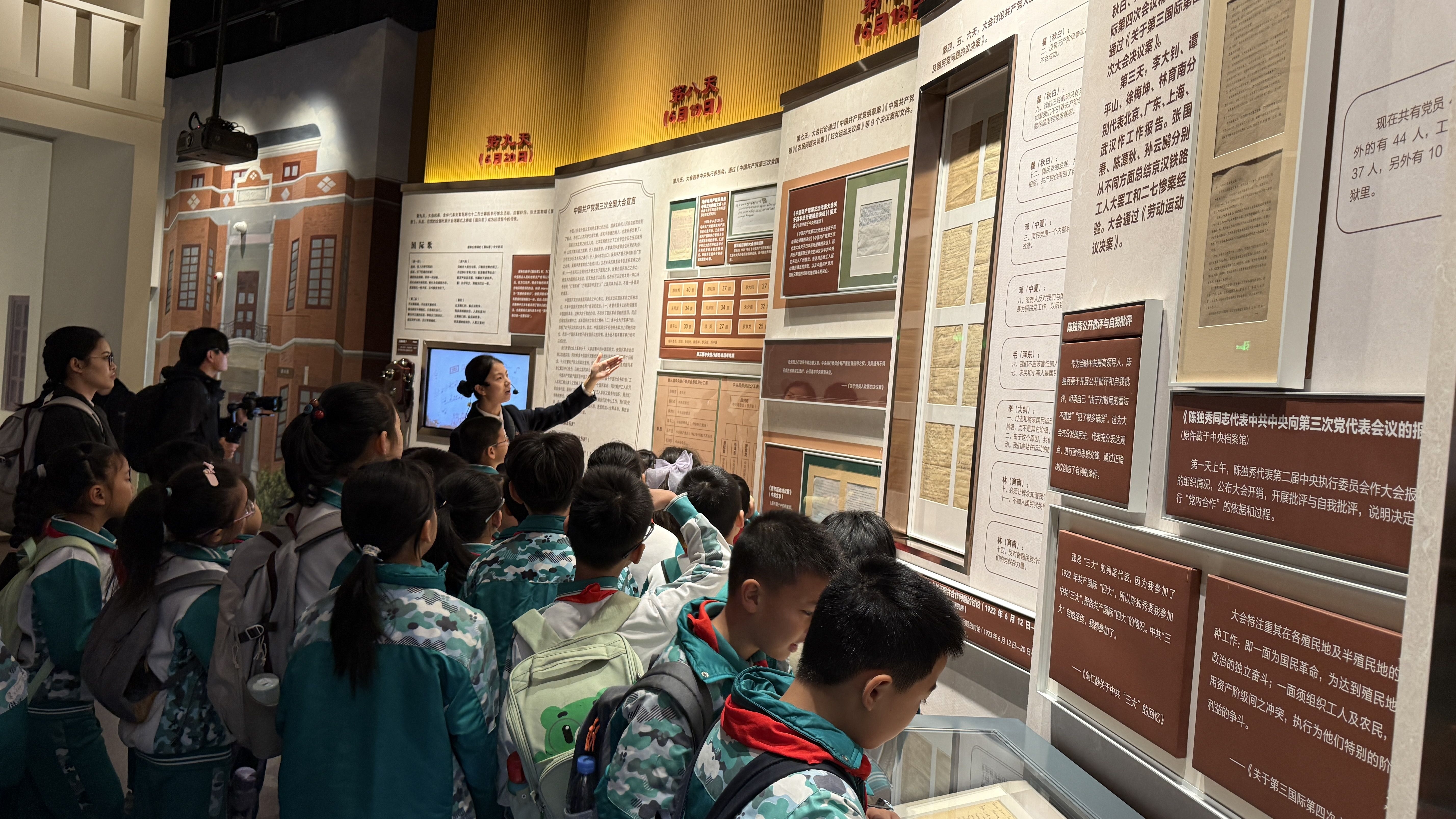 馆中,泛黄的文献、静默的文物、生动的场景复原,宛如一道道时光回廊,将师生带回1923年那个风雷激荡的夏日。讲解员深情讲述中共三大的光辉历程、历史贡献,以及革命先辈为理想信念矢志奋斗、英勇献身的事迹。同学们凝神静听,目光灼灼,崇敬与思索在眼中交织,深切体会到今日山河无恙、岁月静好的来之不易。