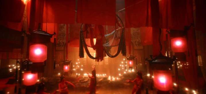 以及红衣舞姬在血红色的烟雾里围成圈跳舞,她们的裙摆与悬挂的红绸连成一片,像极了某种邪教仪式的现场。