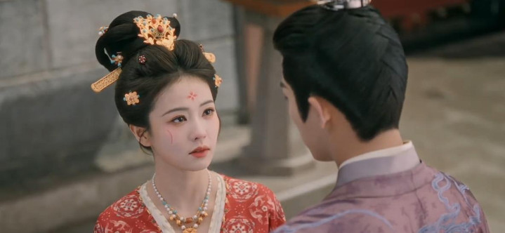 这些暖色调不仅贴合唐代以浓艳华丽为美的审美,更呼应了她性格里欢脱活泼的一面,让整个人看起来明媚又鲜活。
