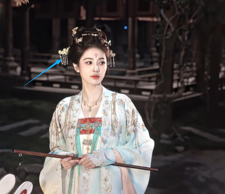除了衣服,她的头饰也有很多小巧思。