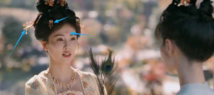她的妆容是标准的唐代仕女妆,眉间的花钿和脸颊的斜红,既还原了历史,又让她看起来娇俏动人。