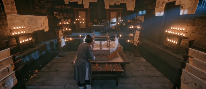 殿内摆放着浑天仪与圭表,金色的铜制构件在烛光下泛着冷冽的光泽,屋顶的藻井被设计成星空的模样。