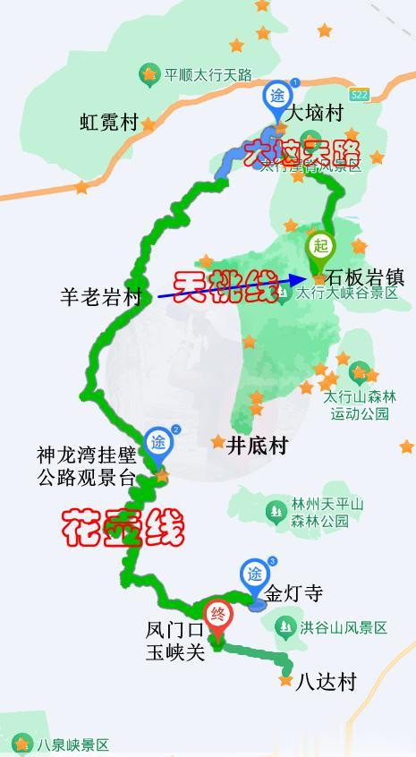 南太行北线高难度版路线:山西长治/河南林州→太行天路→岳家寨→西井山天路→虹霓村(宿)→天桃线→石板岩镇(宿)→鲁班天梯&新梯头观景台→高家台→井底村→石板岩镇(宿)→龙床口瀑布观景台→大峡谷观正北景台(又名:钱岭大峡谷观景台)→大垴天路→管洞水观景台→花壶公路(宿)