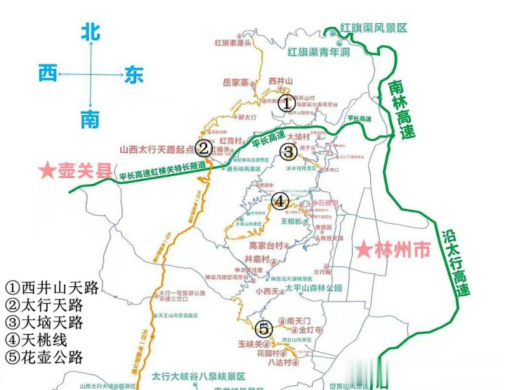 花壶公路:起点林州合涧镇八达村(晋豫古道千年驿站),终点壶关县玉峡关镇,约50公里,串联金灯寺(明代石窟,国家文物保护单位)、神龙湾挂壁公路观景台(空中俯瞰挂壁公路奇观)、凤门口玉峡关(可远眺山西平顺与河南林州的交界山脉)等景点,全程柏油路,开车无压力。
