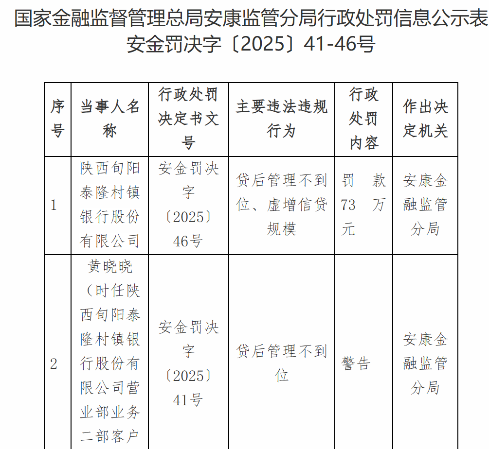 国融汇通 陕西旬阳泰隆村镇银行因贷后管理不到位、虚增信贷规模被罚款73万元